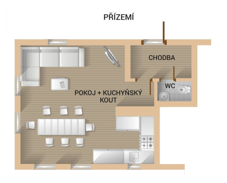 Cena nezahrnuje rekreační poplatek, který se platí obci za každou osobu nad 18 let a činí 30 Kč/noc.