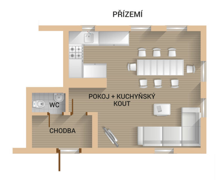 Cena nezahrnuje rekreační poplatek, který se platí obci za každou osobu nad 18 let a činí 30 Kč/noc.